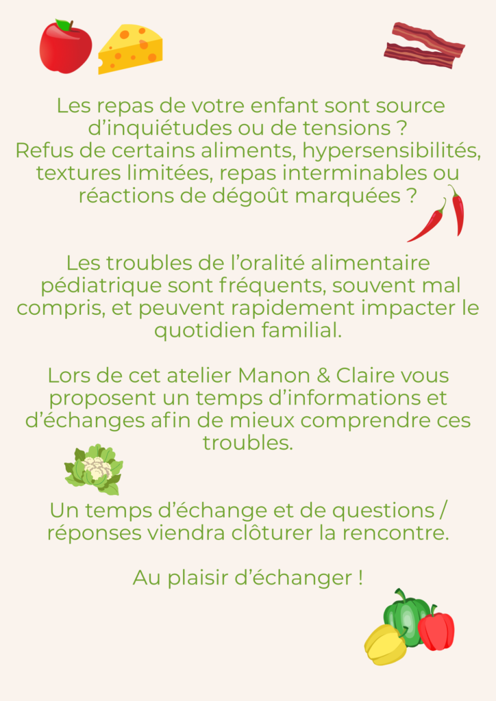 Les repas de votre enfant sont source d’inquiétudes, de tensions ou de conflits répétés ? Lors de cet atelier, Manon Fillion et Claire Trabal, orthophonistes, vous proposent un temps d’information et d’échanges pour mieux comprendre le développement de l’oralité alimentaire, repérer les signes d’alerte et informer sur le parcours diagnostique.